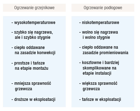 - Dominacja systemu podłogowego - grzejniki stanowią wyłączenie uzupełnienie systemu grzewczego. Dla obydwu z nich utrzymywana jest niska temperatura.